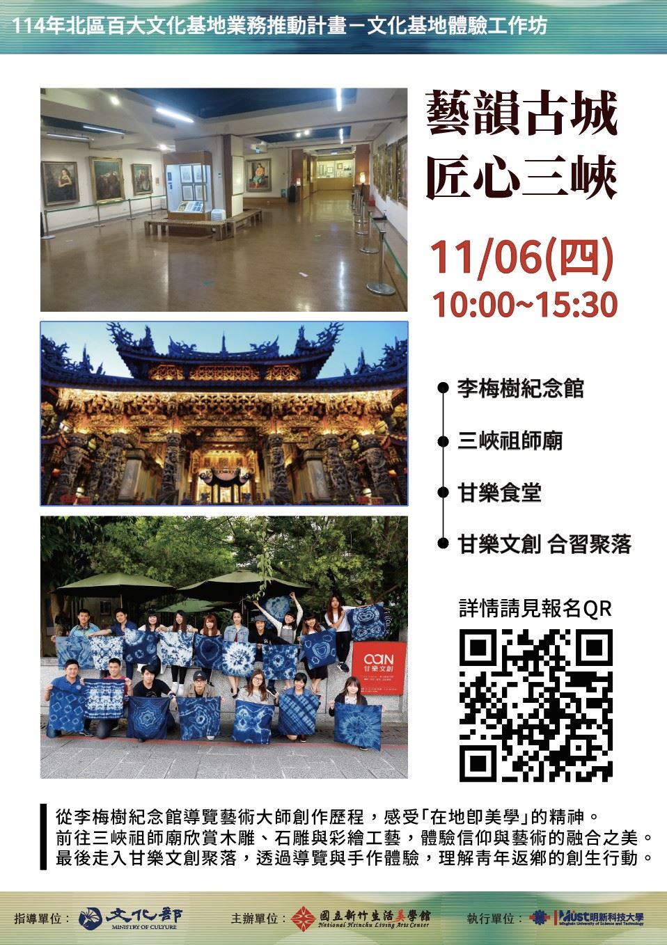 本場工作坊將帶領大家從李梅樹紀念館出發,透過專人導覽認識大師創作歷程與「在地即美學」的精神;接著走入三峽祖師廟,細細欣賞木雕、石雕與彩繪藝術,感受被譽為「民間美術殿堂」的信仰之美。午後移動至甘樂文創聚落,在甘樂食堂享用地方風味餐,並透過文創導覽與手作體驗,理解青年如何以行動實踐地方創生、延續匠人精神。